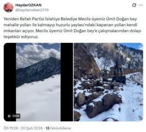 İlçe Başkanı Haydar Özkan, sosyal medya üzerinden paylaştığı videoda, Meclis Üyesi Ümit Doğan’ın iş makinesiyle özellikle Huzurlu Yaylası’nda kar nedeniyle ulaşıma kapanan yolları yeniden açtığını belirtti.